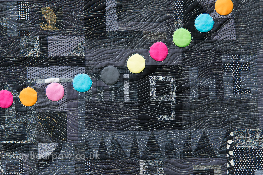 Can you see that I have left a gap in the top strand of lights? I do like a little ‘oddness’ (like the one pink leaf in Greenery Shoots) and I decided to leave a space as if a bulb had just blown, and to hand quilt an empty circle there. But someone on Instagram (Kim Moran-Jones) suggested appliqueing a grey circle instead and I loved that idea (thanks Kim!)!
