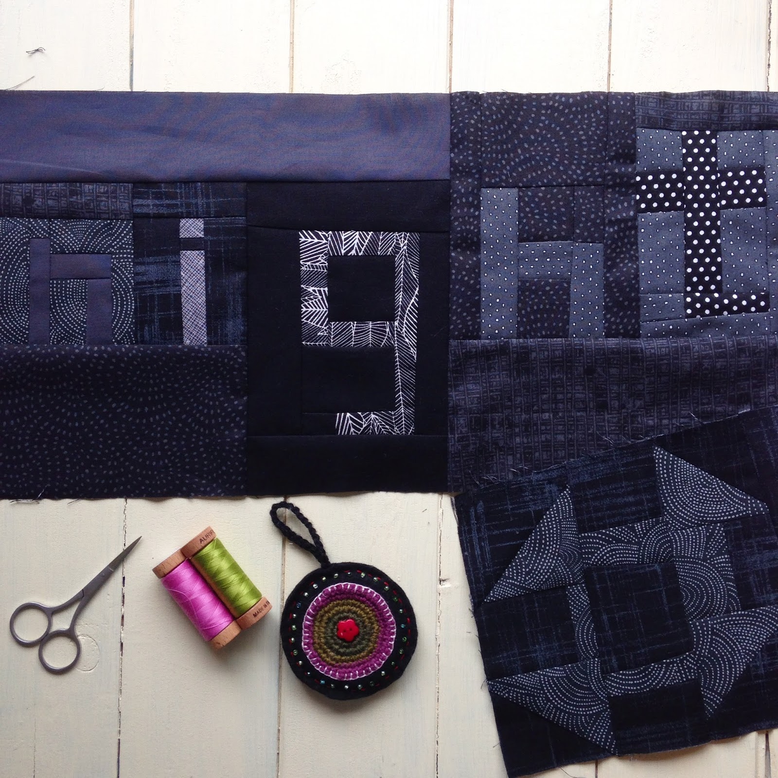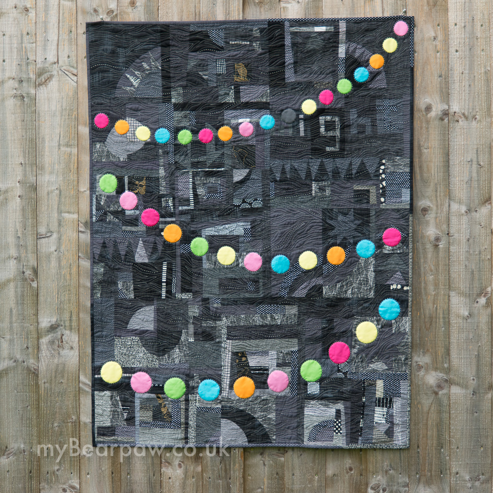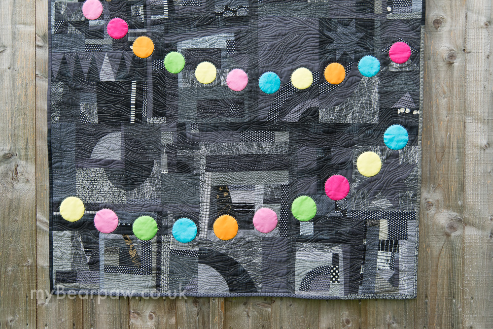 I started off using just dark grey, charcoal and black fabric and making panels of what I always call ‘scrappy improv’, basically lovely playtime in my sewing room!