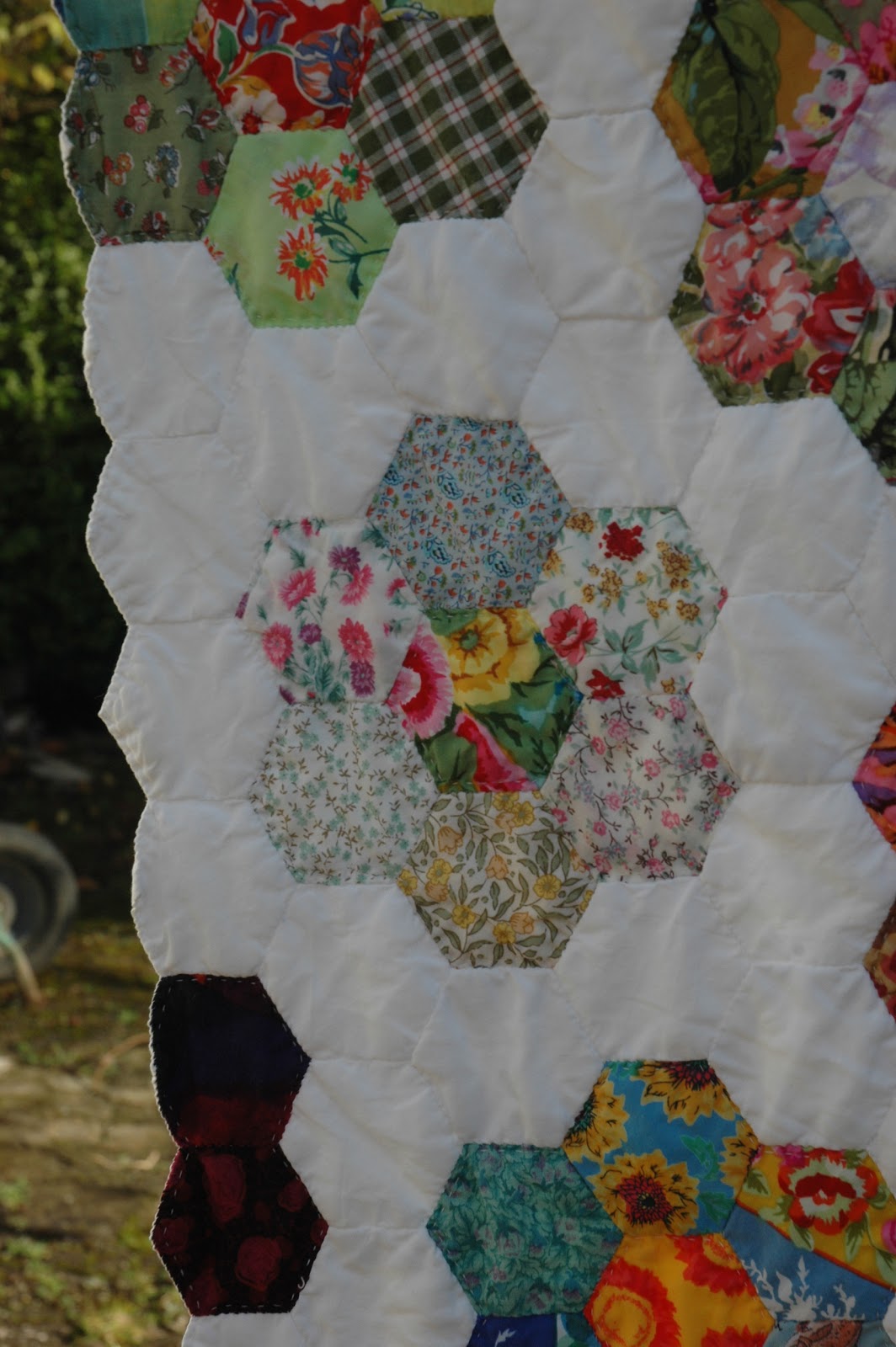 Lovely hexagon quilt. It must be fun looking over all the different fabrics in the quilt. i love doing that with my own quilts.