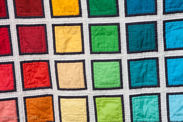 I had plenty of Kona charm squares left to make a rainbow stripe down the back. The binding is charcoal.