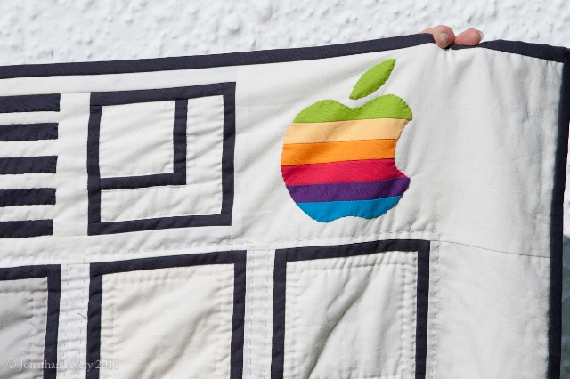 And then in another departure from accuracy, Jonathan thought Felix would love a rainbow Apple logo in the top corner. And I thought it would be such a fun thing to make – I was right! This was strip pieced then hand appliqued again.