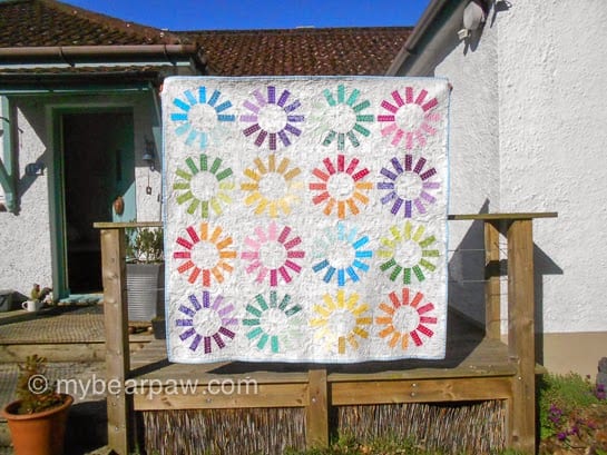 This was really a collaboration between myself and Karen Lewis as all the coloured fabric was screen printed by her. When she came down to stay with me in March I gave her a big bundle of rainbow Kona to go home with and a few weeks later she sent me this!