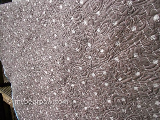 There’s a Dashwood Studio fabric on the back and you can see the FMQ well in this photo. It’s an overall pattern of a kind of trailing mussel with spikes around. I remember it being lot’s of fun to do!