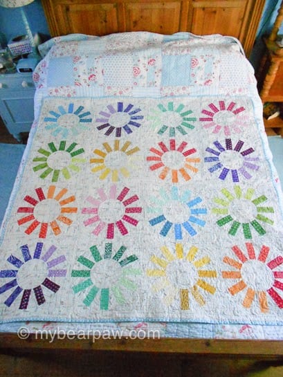 The binding is a turquoise polka dot that was suggested by my husband (who’s really good with binding advice!).