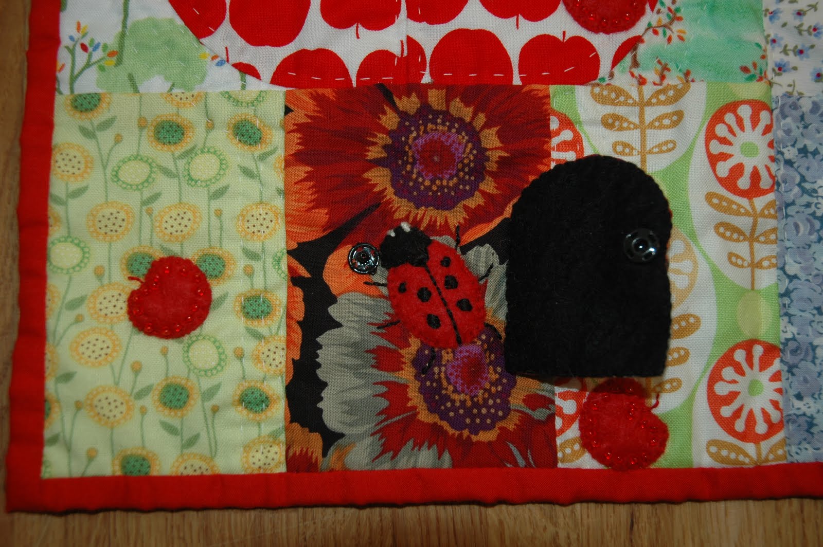 It is a little lady bird! I had to find a way of closing the door properly as otherwise it will flap open if the quilt is hung on the wall, hence the press stud.
