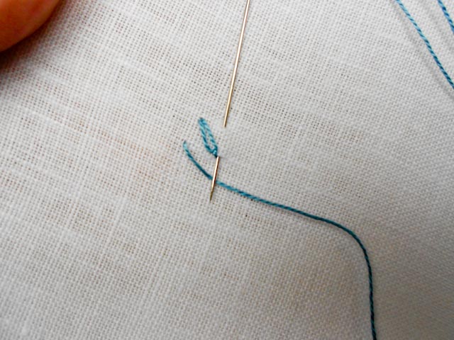 First of all make a detached chain stitch, then take your needle up to make a start on a fly stitch that will ‘cup’ the chain stitch.