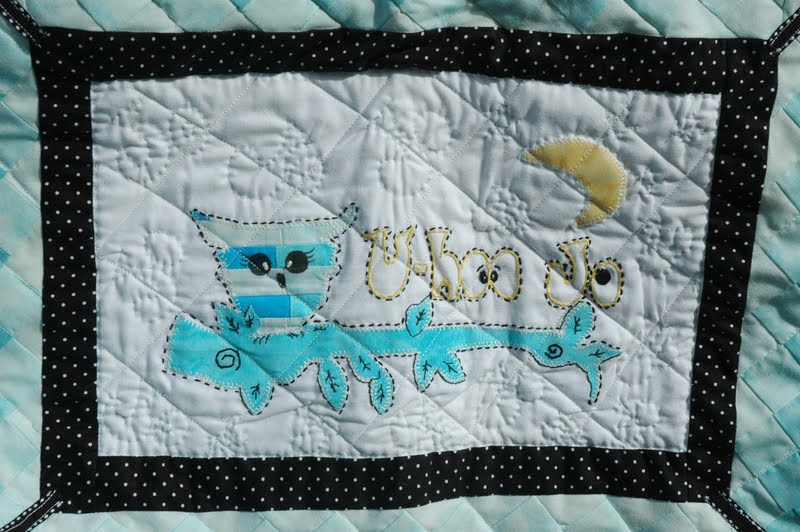There are loads of tiny blanket stitches round the owl and branches and the ‘u-hoo Jo’ (which is so funny!) which don’t really show up even in this close-up. The owl is made from tiny patchwork pieces, and she has hand quilted my name all over. I really love how much work and attention to detail Madame Samm put into this little quilt. Thank you so much!