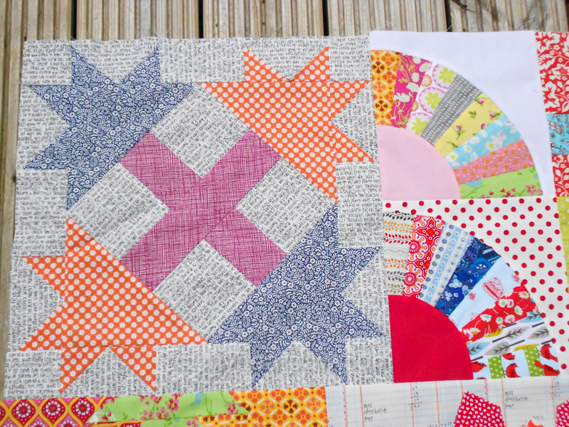 Here is the star of the show IMHO, it’s a crazy Dresden plate made using the EZ Dresden Ruler (which I’d bought a year ago but never used!). The ruler worked like a dream and I have to say that I am totally in love with this block and want to make a whole quilt of just these!