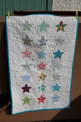Looking around for inspiration I encountered the pattern that Brioni Jenkins had made for Fat Quarterly a few years back. This had houses around the edge and small stars in the centre and was machine appliqued. I realised this was too much work for a day class, but then I remembered the ticker tape quilts that were all the rage a few years back and this cot quilt I had made to sell in the shop…