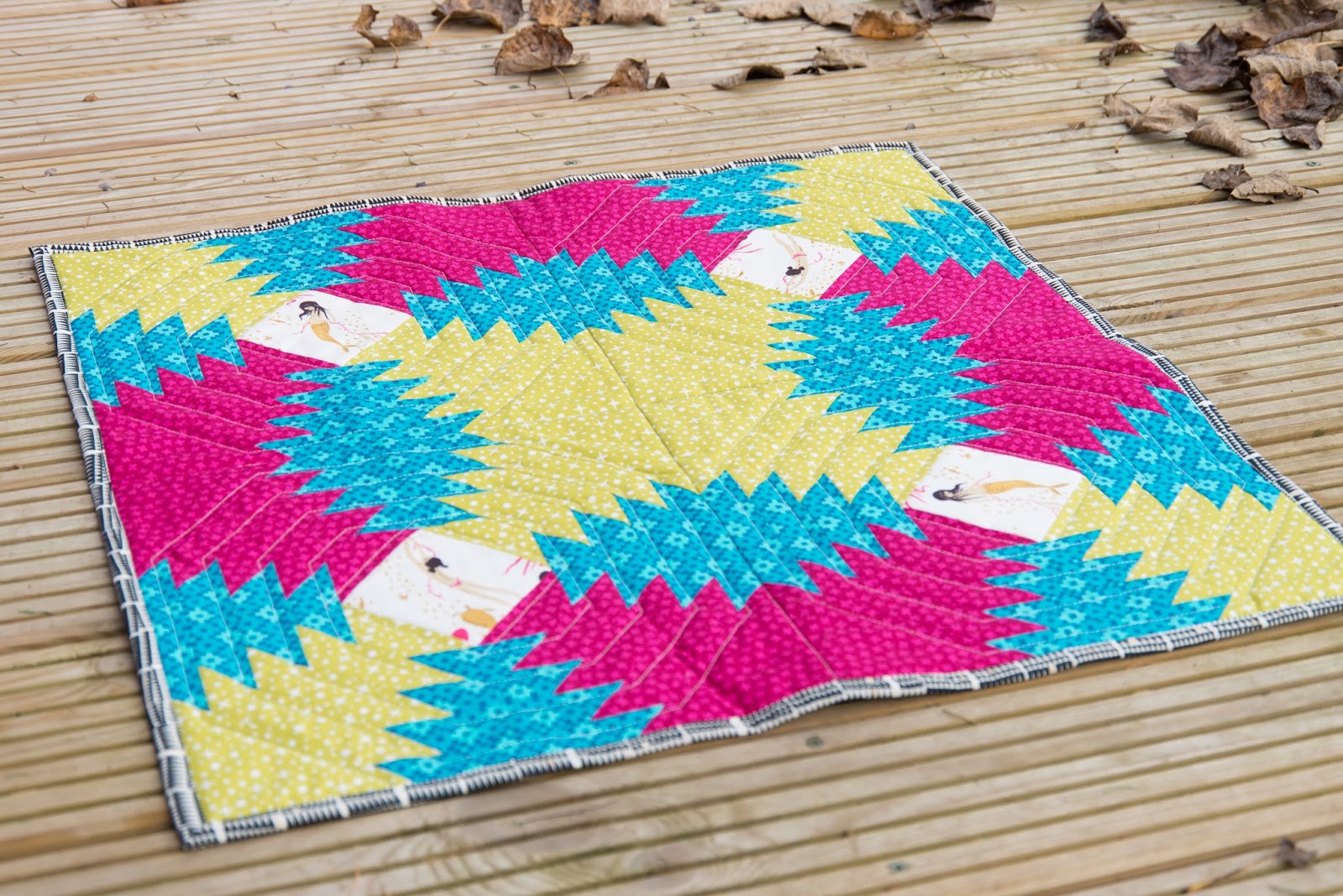I love how dramatic this block can look if you use just a couple of fabrics. This mini quilt features some of my current favourite fabrics by Elizabeth Hartman, plus those sweet Heather Ross mermaids from Mendocino.