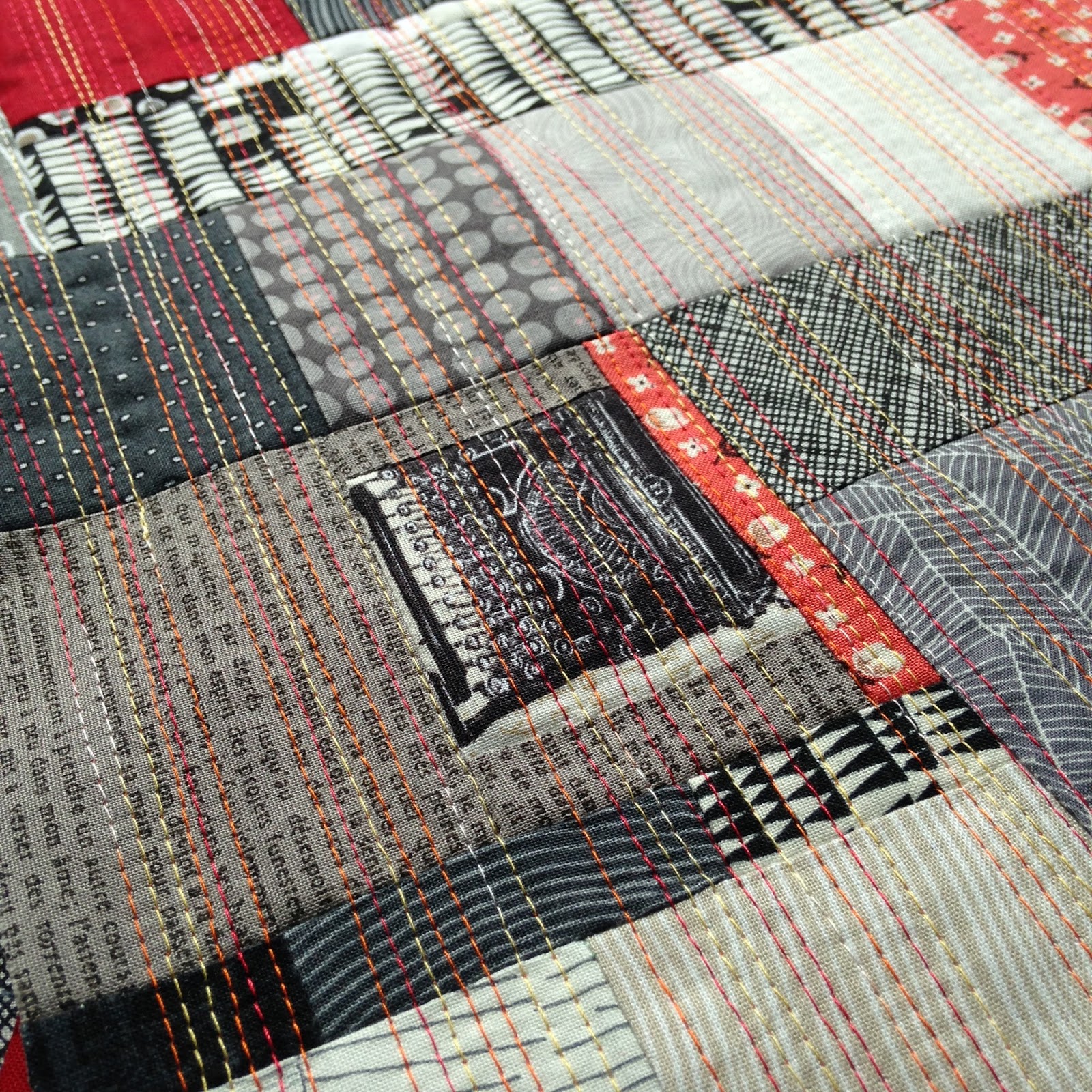 I’ve been teaching the ingenious Scrappy Trip Around the World method for a few years now and have amassed a number of sample blocks. I got the idea of keeping it monotone with just one other colour from a student (if you come to my class with a good idea for a quilt I will steal it from you!). Of course I was going to keep it to just red but pink and orange found it’s way in too!