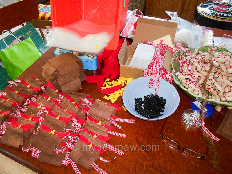 Part of the deal was that we had to supply all the materials required so that 35 – 40 people a day could make a robin along with me. So that meant making up a lot of kits! My very supportive husband, Jonathan, stepped in to the breach and made up 172 kits. Thank you so much Jonathan! This is our dining room table a week or so a go when he was in full ‘outworkers’ mode.