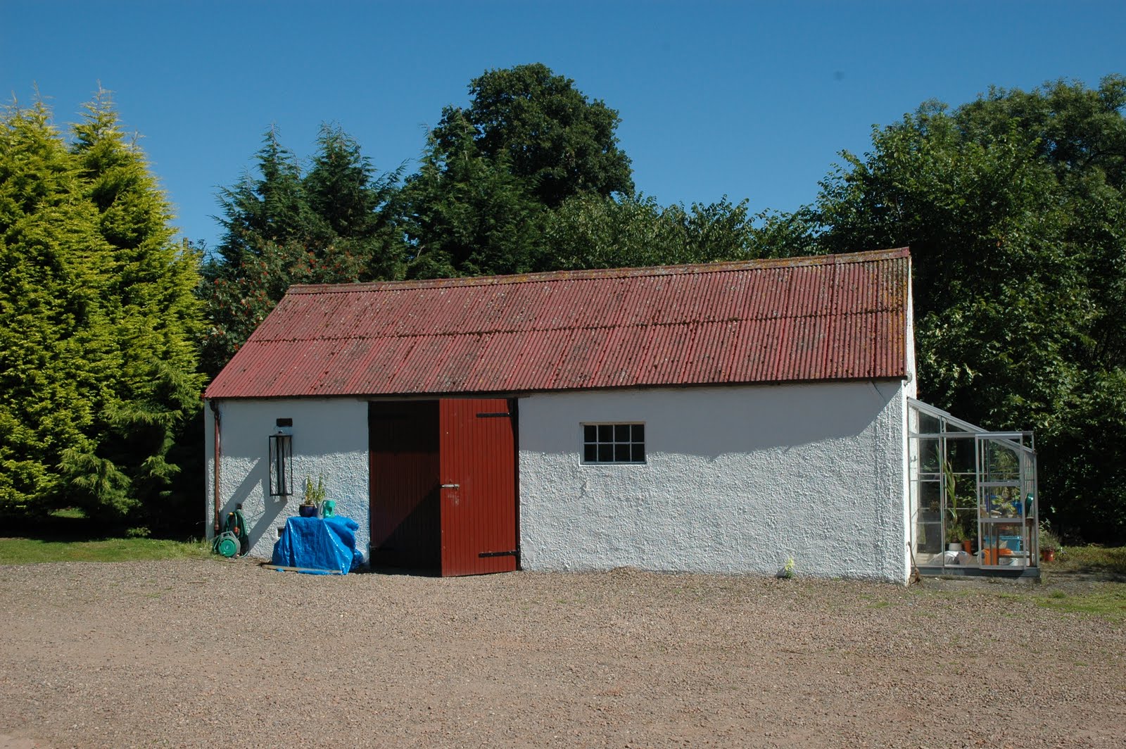 Opposite the bungalow, on the left as you come through the gates, is our barn. Impressive eh? We have just ordered a new roof for it as it needs a big dose of TLC. There is a greenhouse attached to one side.