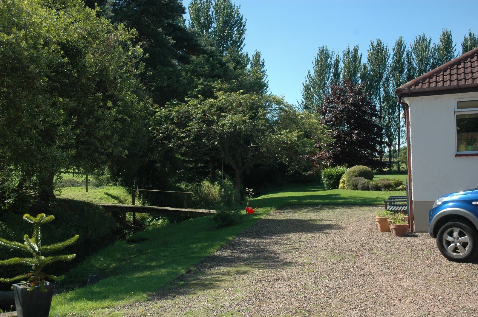 Here is the garden, well just a big expanse of lawn with a couple of beds full of heathers and shrubs. The little house was a treehouse that the previous owners left behind. Felix cut it’s legs off and plans to make it in to a hen house. The line of Poplars at the end is our other width boundary. We hope to carve out part of the land at the back there and build a house to sell. With the money from that we will build our own house where the bungalow is. This is a long term plan.