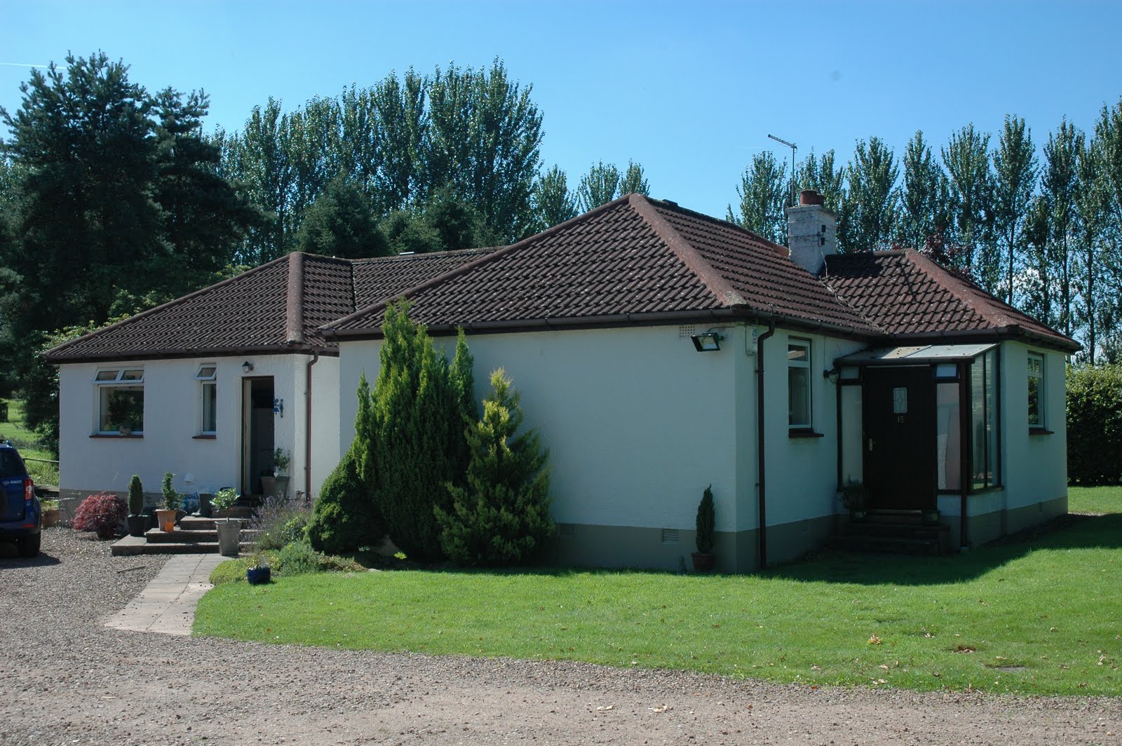 So this is the bungalow, on the right handside as you come through the gates. The door to the right is supposed to be the front door but the other door (with all the potted plants outside) is the one that gets used all the time as it leads into the kitchen/living room.
