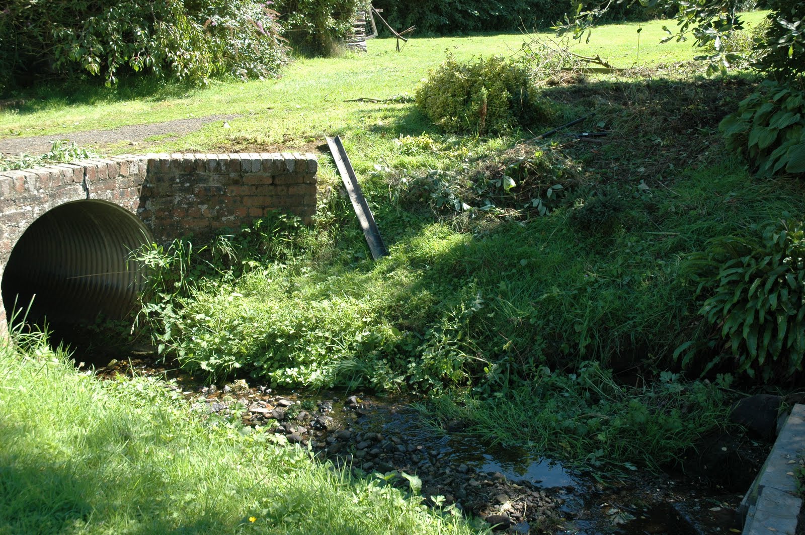 Here is a view of the stream as it goes under the little brick bridge, the water level is very low at the moment. We have started damning and widening it above to make more of a pool. I can’t remember why this is happening but Felix and Jonathan are very keen on it, they must have a plan, maybe involving fish? There are little fish in the stream, but not anything we could live on!